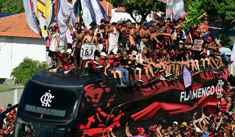 "Entraram no ônibus pelo teto. Só bora!", publicou o zagueiro Léo Pereira em um story no Instagram. Pereira posou sorrindo em uma foto com um torcedor e o atacante Luiz Araújo.