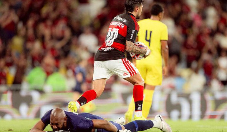 Nicolás de la Cruz abriu o placar e marcou apenas pela quarta vez desde que chegou ao Ninho do Urubu, em 2024, vindo do River Plate — o meia não balançava as redes desde abril do ano passado, em duelo contra o Central Córdoba, pela Libertadores.