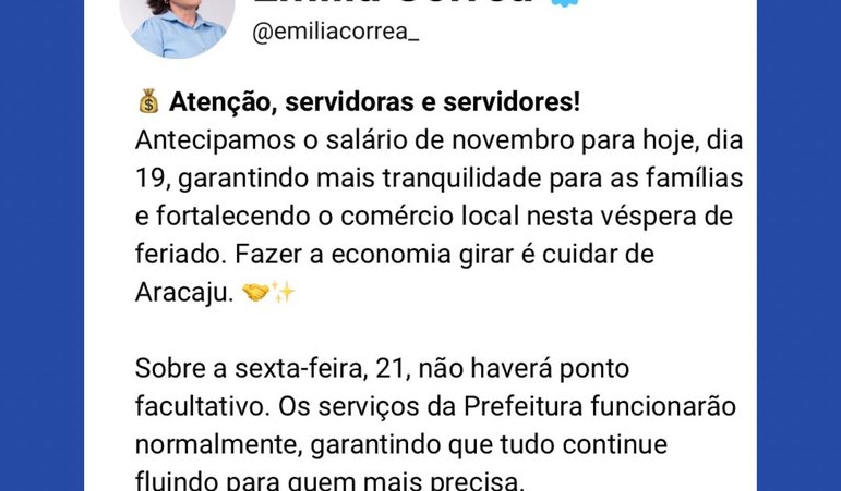 A Prefeitura de Aracaju anunciou nesta quarta-feira, dia 19, a antecipação do salário referente ao mês de novembro para todas as servidoras e todos os servidores municipais. A medida, segundo o comunicado oficial, tem como objetivo oferecer mais tranquilidade às famílias na véspera do feriado e contribuir para o fortalecimento do comércio local.
