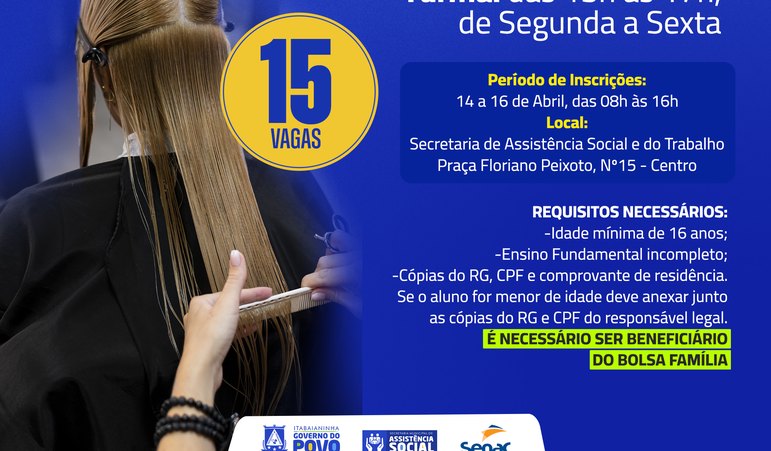 As inscrições estão sendo realizadas presencialmente, na sede da Assistência Social, entre os dias 14 e 16 de abril, das 8h às 16h. Os interessados devem apresentar RG, CPF e comprovante de residência. As vagas são limitadas.