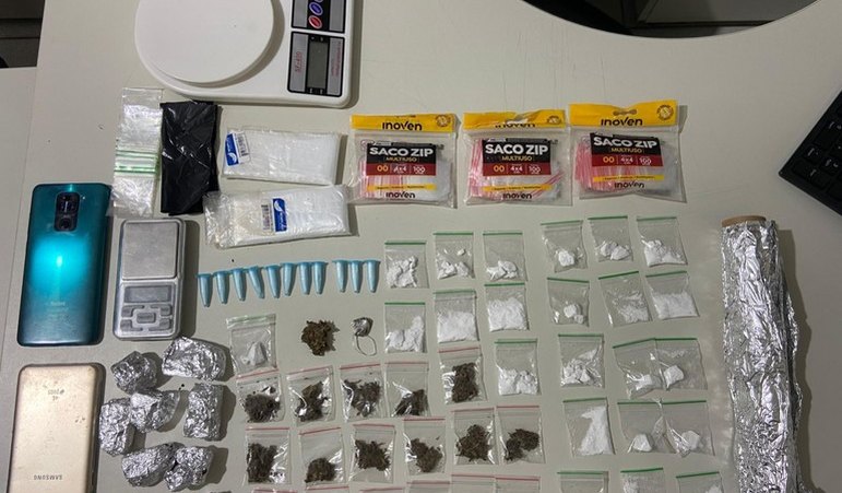 Durante a abordagem, os policiais encontraram com o suspeito uma quantidade significativa de drogas, incluindo diversos pacotes de maconha e cocaína, eppendorfs com a mesma substância, três pacotes lacrados de sacos ziplock utilizados para embalar os entorpecentes, pedaços maiores de maconha embalados em papel alumínio, além de uma balança de precisão.
