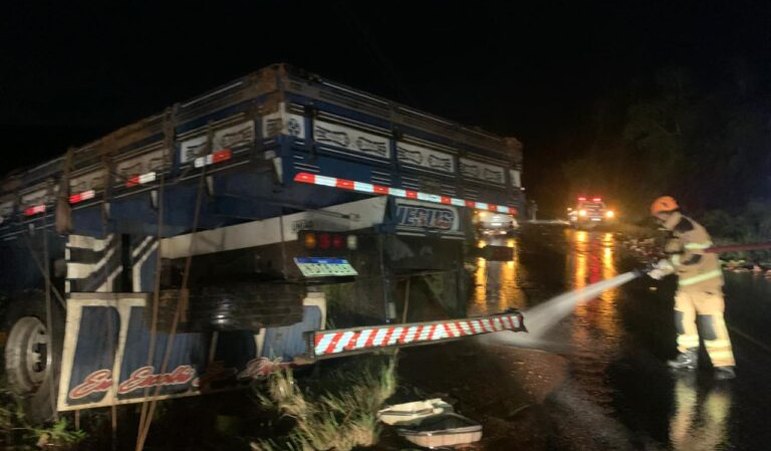 Segundo o Corpo de Bombeiros, o caminhão, carregado de melancias, saiu da pista, capotou e ficou em situação de risco, próximo a uma ribanceira. Chovia no momento em que o fato aconteceu.